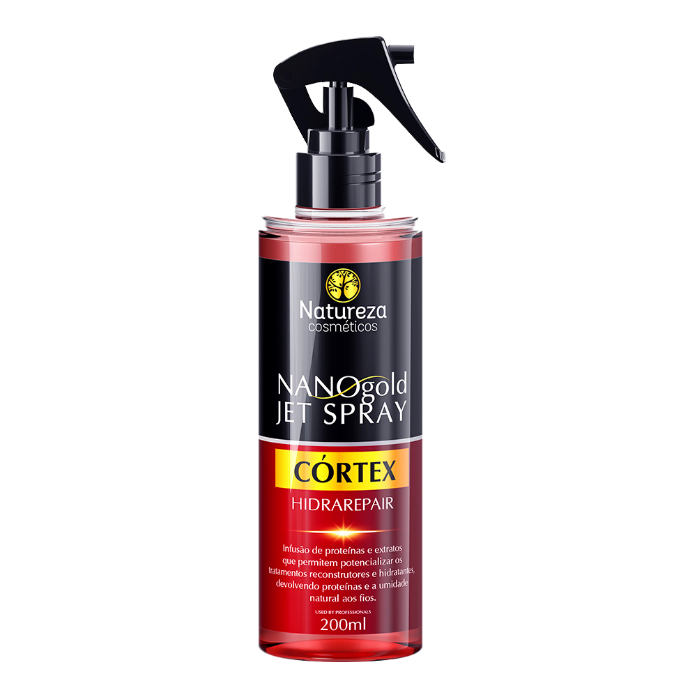 Also, JET SPRAY NANOGOLD CÓRTEX can be used as a preparatory step before keratin or nanoplastia treatments. Spray it along the entire length of the hair before applying the keratin formula or nanoplastia product. This ensures deeper absorption of active ingredients and improves the results of the treatment, leaving hair smoother, more hydrated, and restored.