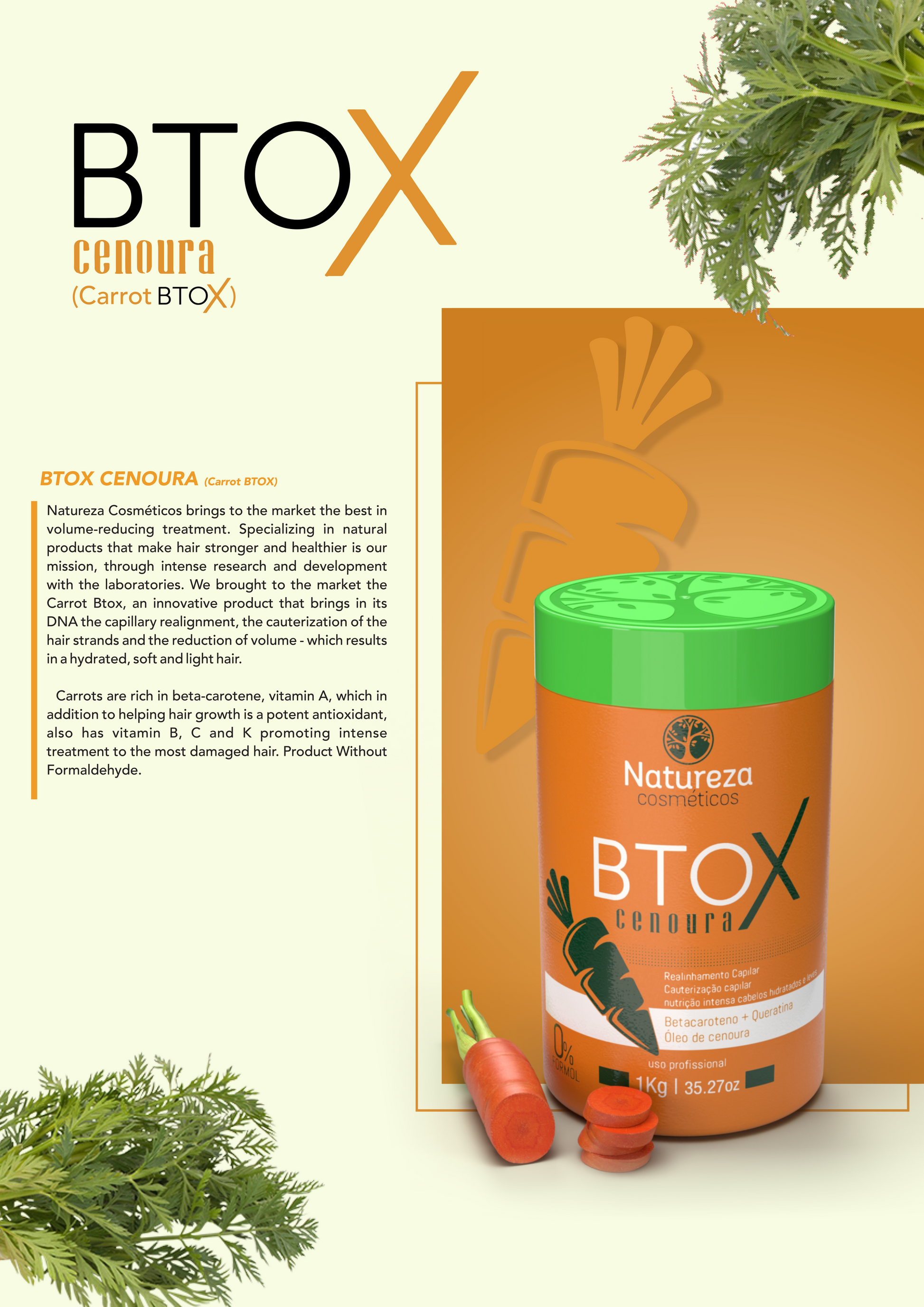 We brought Carrot Btox to the market, an innovative product that brings hair realignment, cauterization of strands and volume reduction in its DNA - which results in hydrated, soft and light hair. Carrots are rich in beta-carotene, vitamin A, which in addition to helping with hair growth is a powerful antioxidant, it also has vitamins B, C and K, promoting intense treatment for the most damaged hair. Formaldehyde Free Product.