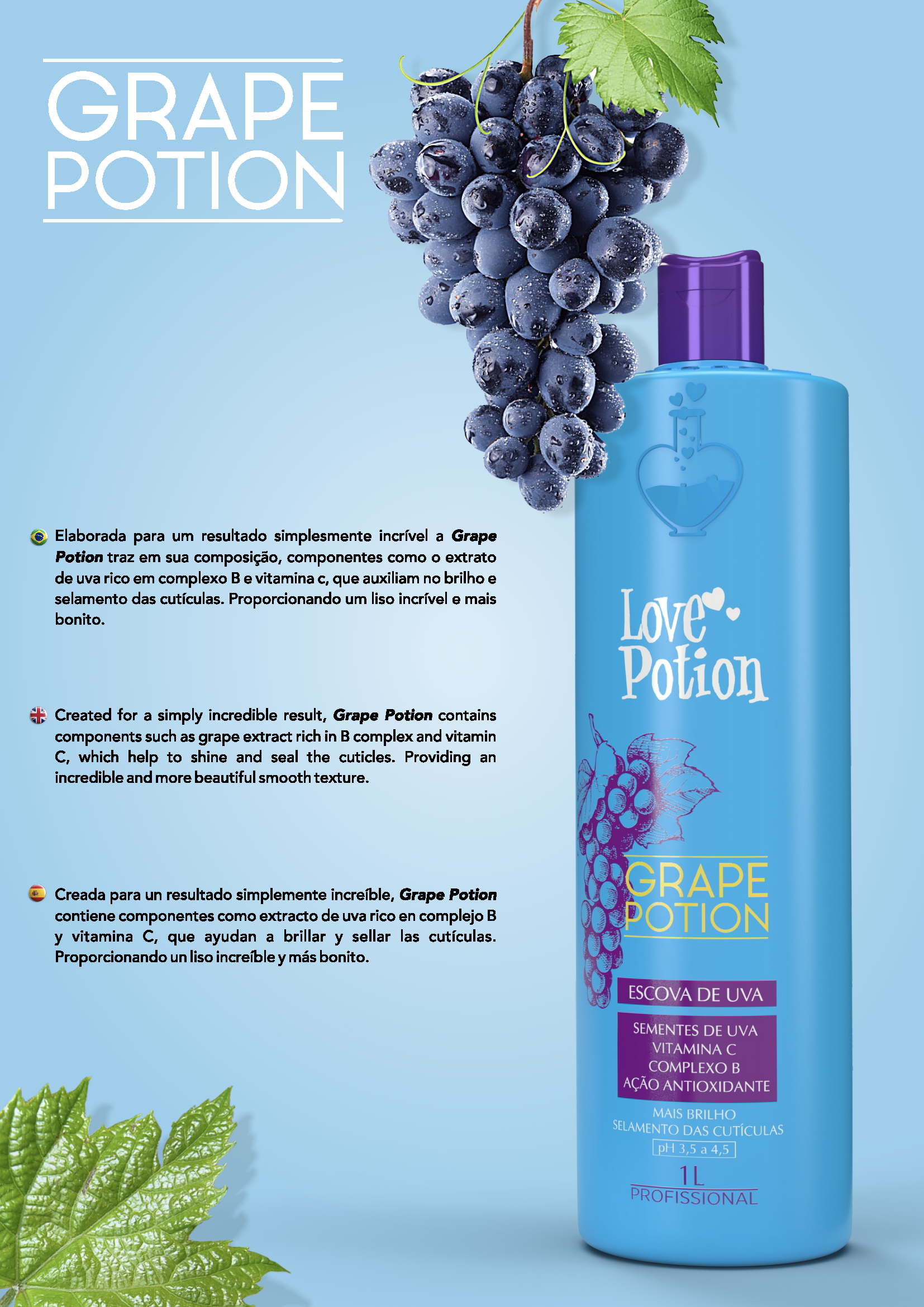 Unlock the secret to irresistibly smooth, frizz-free hair with Love Potion Grape Potion Nanoplasty. Crafted for stunning results, this advanced straightening treatment features grape extract along with a complete B-vitamin complex and vitamin C to seal cuticles, impart brilliant shine, and restore silky smoothness. Its acid-based nanoplasty formula is gentle yet highly effective—even on color-treated hair with moderate damage.